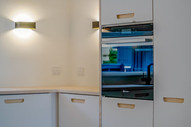 Løsningen, et trelænget køkken, har snedkerlåger beklædt i hvid FENIX-laminat, som giver en silkemat overflade. Massive trækanter og indfræste trægreb i ask samt en bordplade i massiv ask giver varme og sjæl til køkkenet. Bordpladen er leveret med en underlimet vask i sort siligranit.